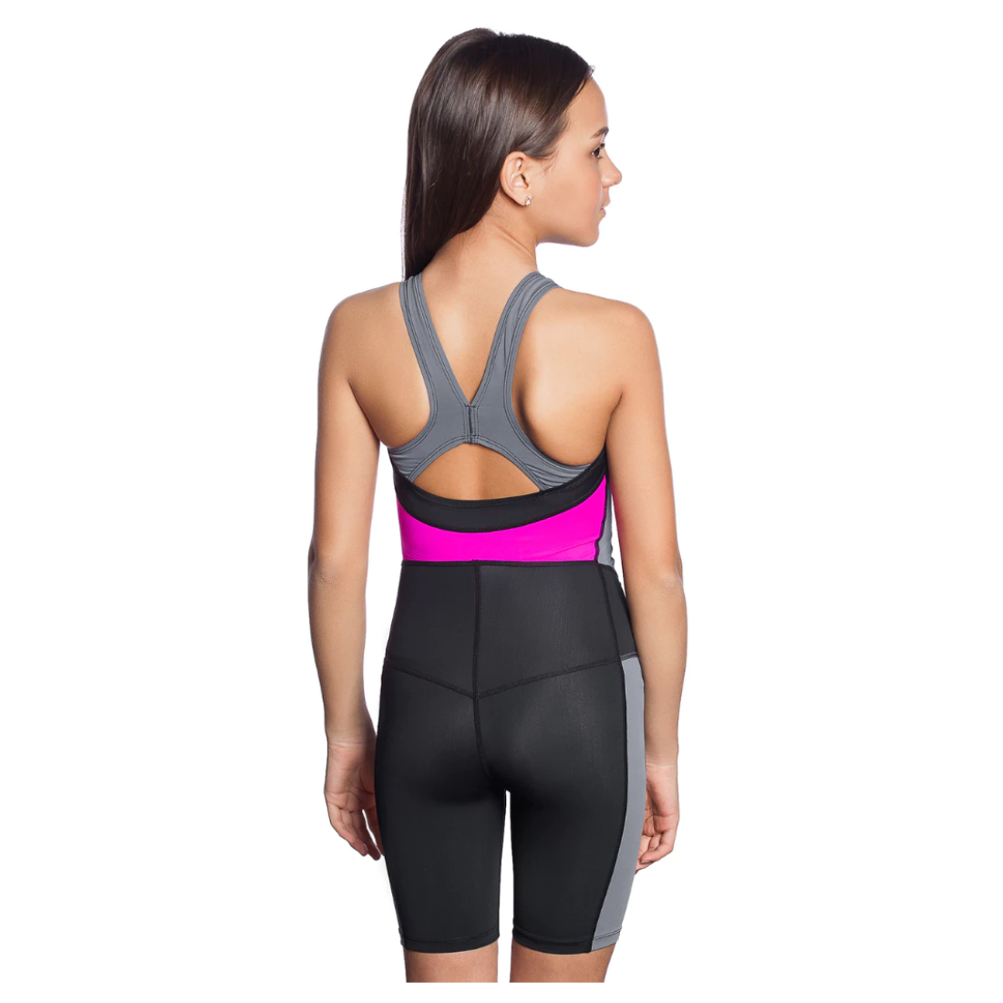 Mad Wave's ATHLETIC JUNIOR knee length one-piece swimsuit is designed for regular training in the pool. The model features Power Back design and does not hold down your movements in the water. Made of extra-durable chlorine-resistant fabric (Xtra Life LYCRA fabric), which lasts up to 10 times as long as conventional swim fabrics.